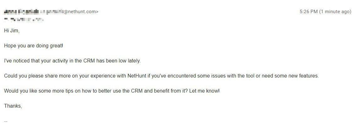 Another responsibility for our Customer Success representatives is also to pay attention to clients with low account activity. We defined some triggers that may be a sign of an upcoming customer churn, such as if there is no workspace activity for two weeks. If so, they reach out with an email to get to know what went wrong and if they need any help from our end.
