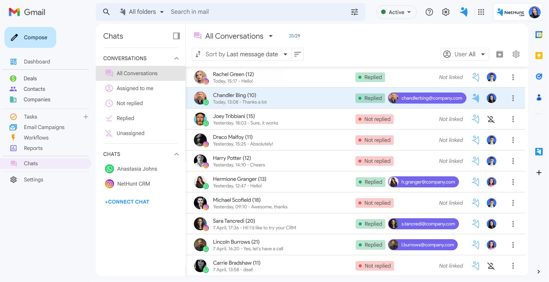 With the integration, NetHunt CRM users no longer have to switch between multiple mobile apps to communicate with leads and clients. From now on, all chats across different channels can be managed from within the CRM interface. The integration also eliminates the need for manual entry of customer data and communication logging.